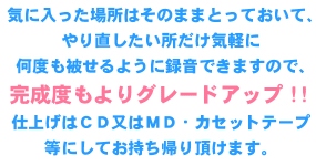 興味を持たれた方、 実際にレコーディングを 体験してみたい方は、 是非一度、まずは お電話でお問い合わせ下さい。 TEL 043-234-1000 三報社 レコーディングスタジオ Copyright(C) 2000 Sampow.co.jp all right reserved